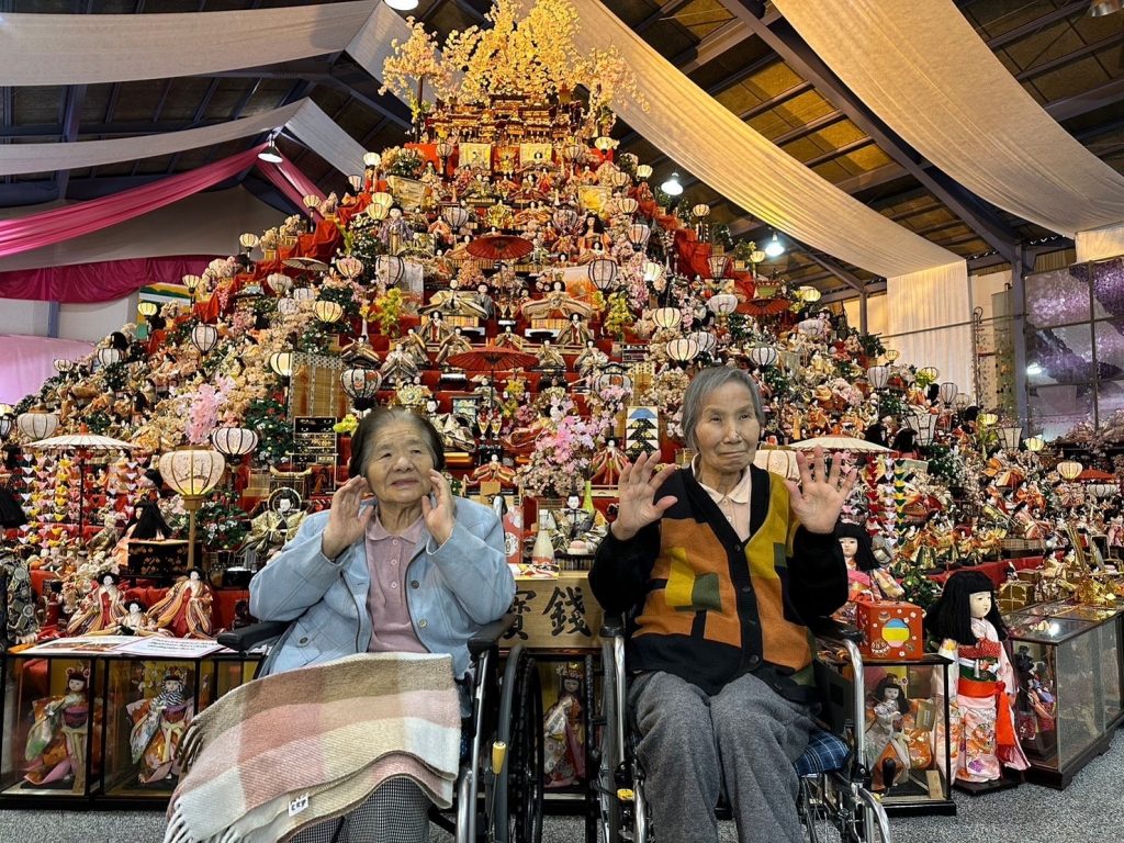 会場に着き大きいピラミッド型に飾られたお雛様を見て「すごいな、並べるん大変だろな」と感心され、昔ながらのお雛様も飾られており懐かしまれていました。