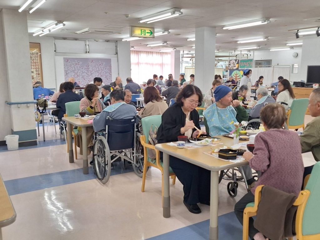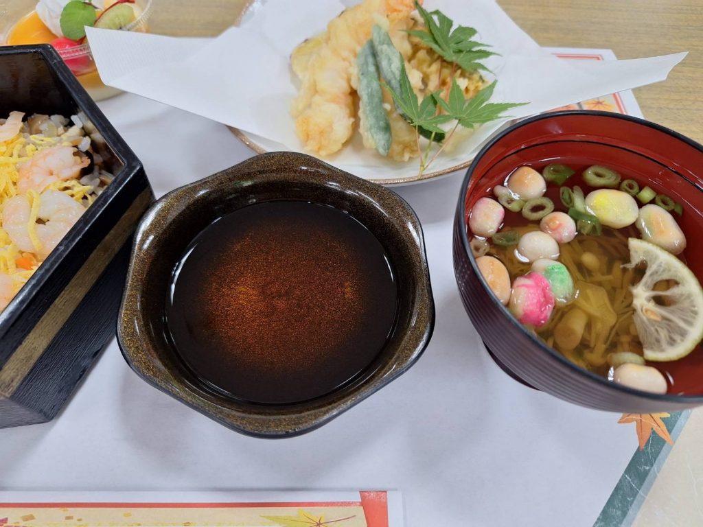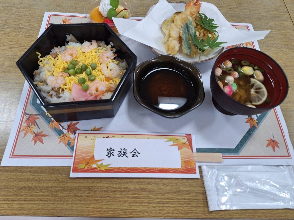職員による講演のあと、ご家族にはお寿司、天ぷら、手作りプリンをご用意し、ご利用者様と一緒に召し上がっていただきました。