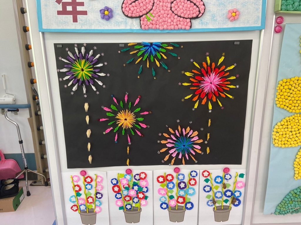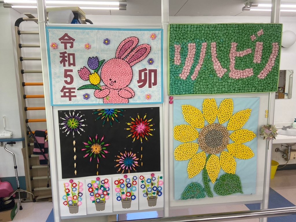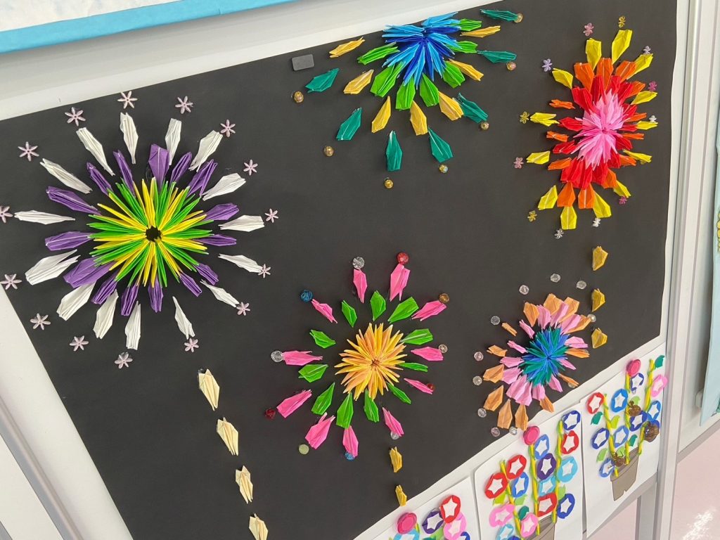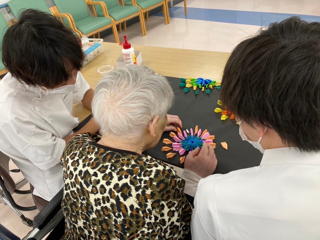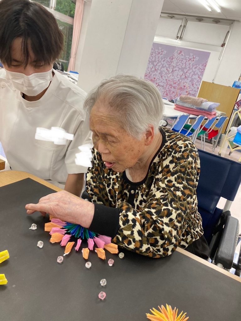 リハビリの学生にも手伝ってもらい、綺麗な花火が完成しました!作品はさくらの郷1階に飾り、見る人に夏を感じていただいています!