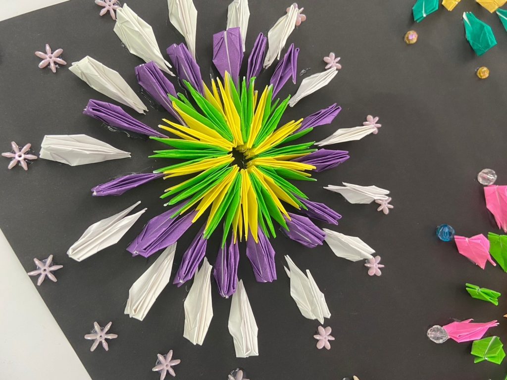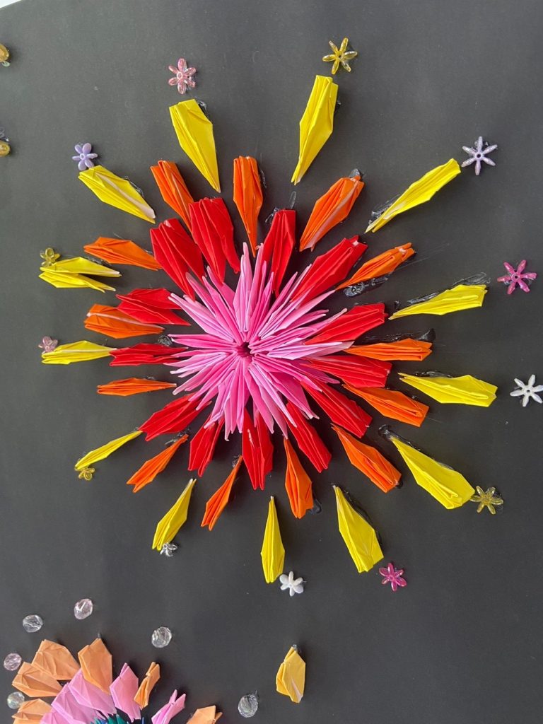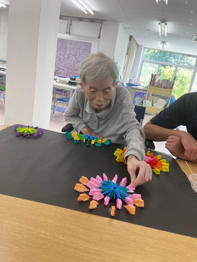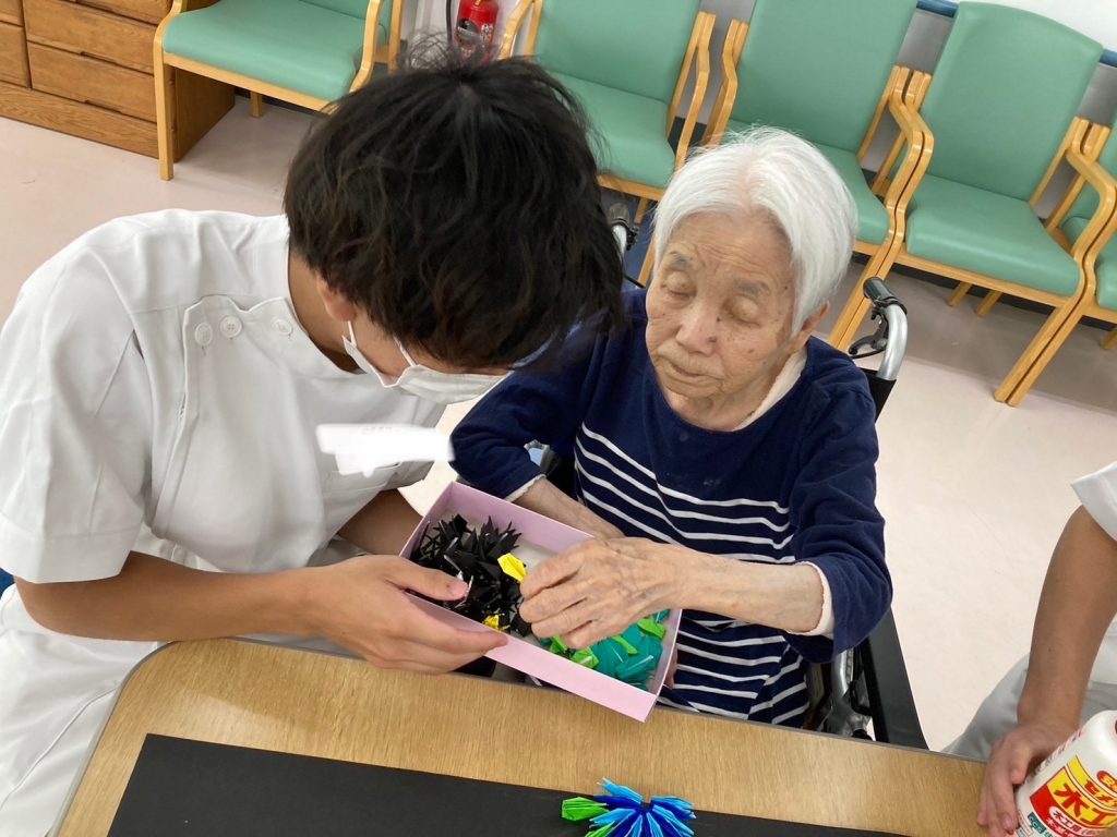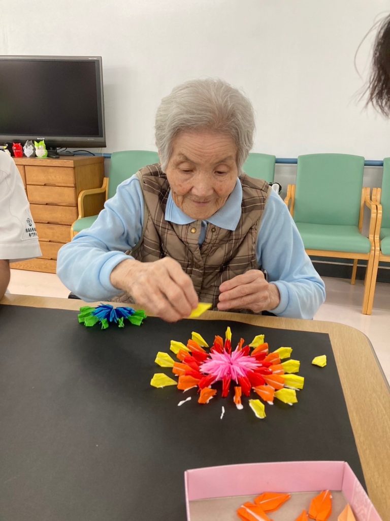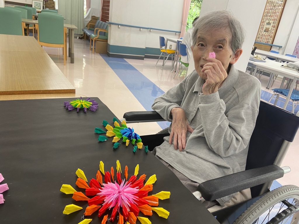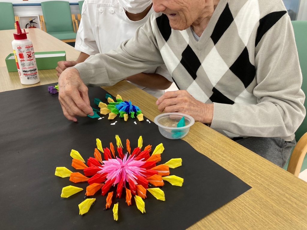 鶴の折り紙を利用して、花火の貼り絵を入所者様と一緒に作成しました!
