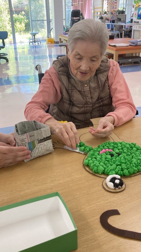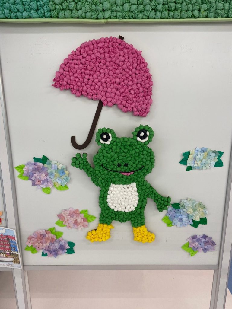 カエルの壁面飾り【2024年6月】 さくらの郷 2024.06.032024.11.18 入所者様と一緒に何日もかけて作成していたカエルの壁飾りが、先日完成しました!🐸 可愛らしいカエルときれいな紫陽花は好評で、季節を感じる作品となっています☺
