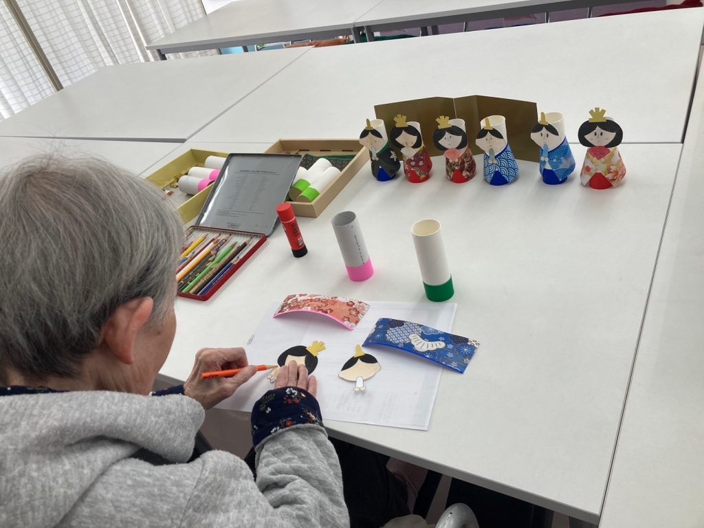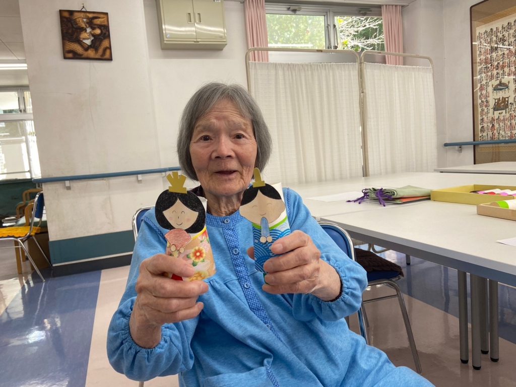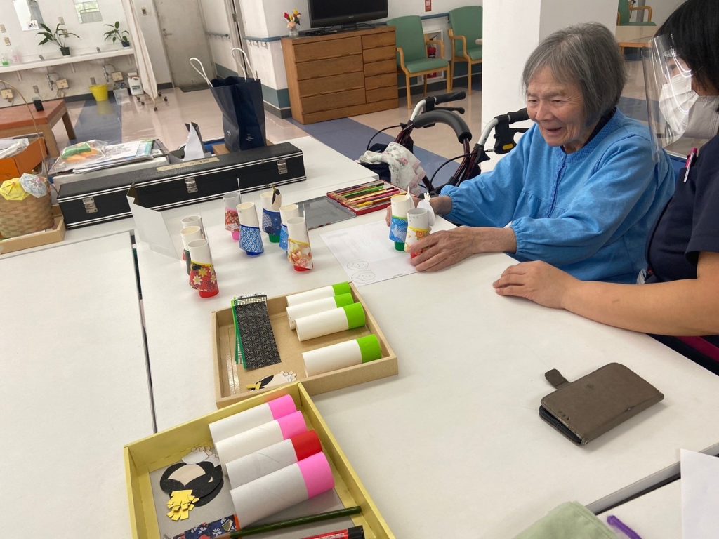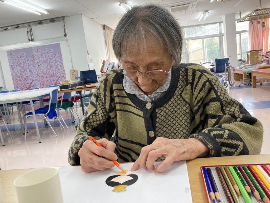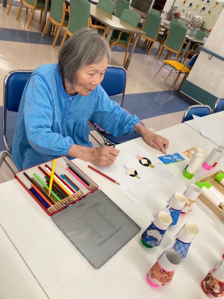 入所者様には着物の色を選んでいただき、目入れや扇子の色付け、貼り付け作業をしていただきました!