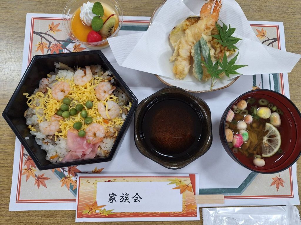 家族会(さくらの郷)【2025年10月】 さくらの郷 2025.10.26 10月25日(土)に開催した家族会の様子です。 たくさんのご家族に参加いただきました。 職員による講演のあと、ご家族にはお寿司、天ぷら、手作りプリンをご用意し、ご利用者様と一緒に召し上がっていただきました。