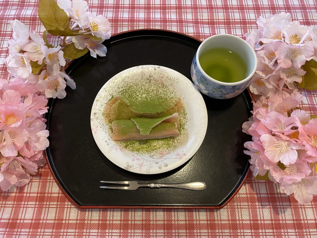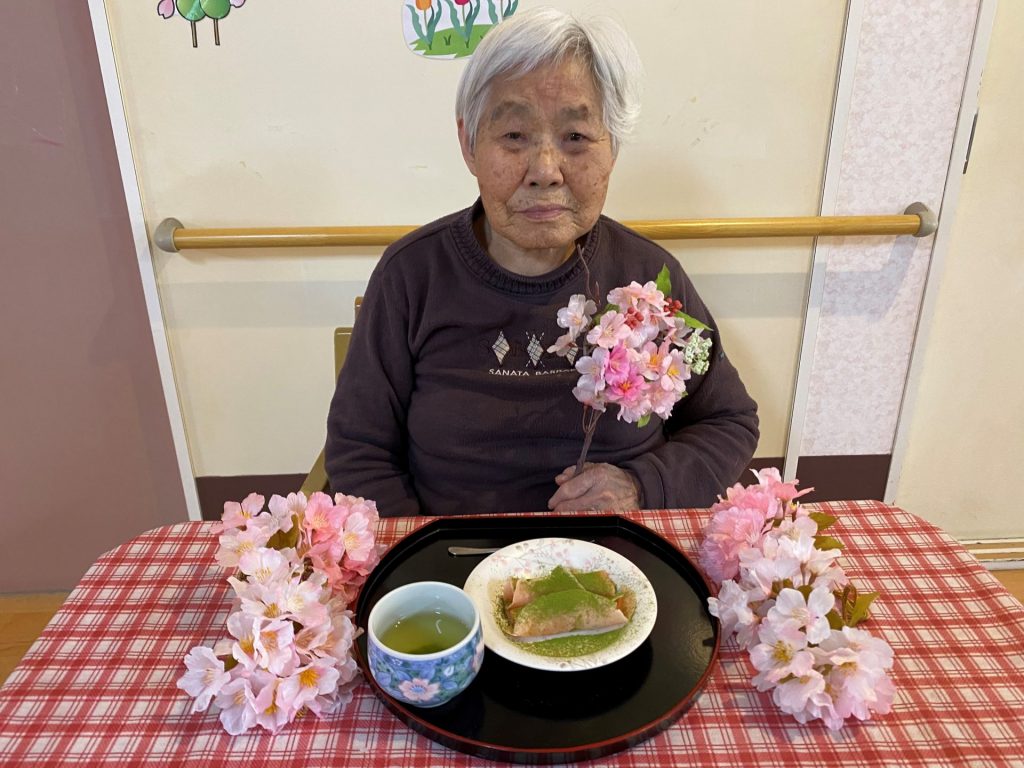 グループホームさくらでは職員が白玉粉と薄力粉を焼き、中にあんこを入れてさくら餅風置き換えておやつ作りをしました。