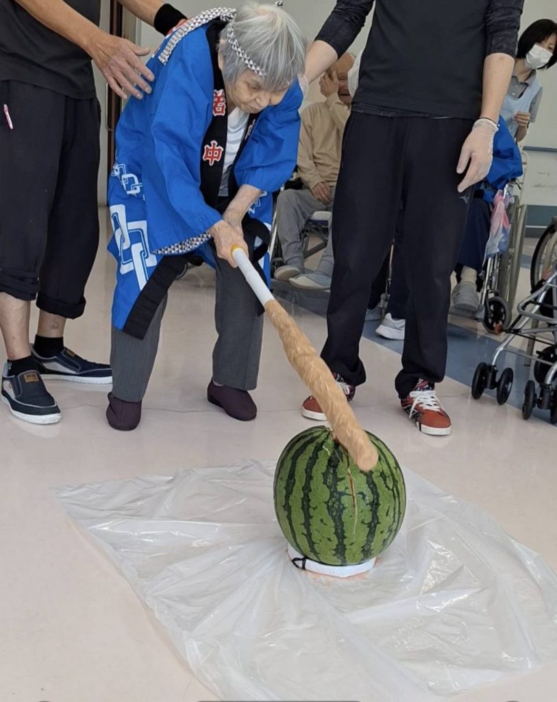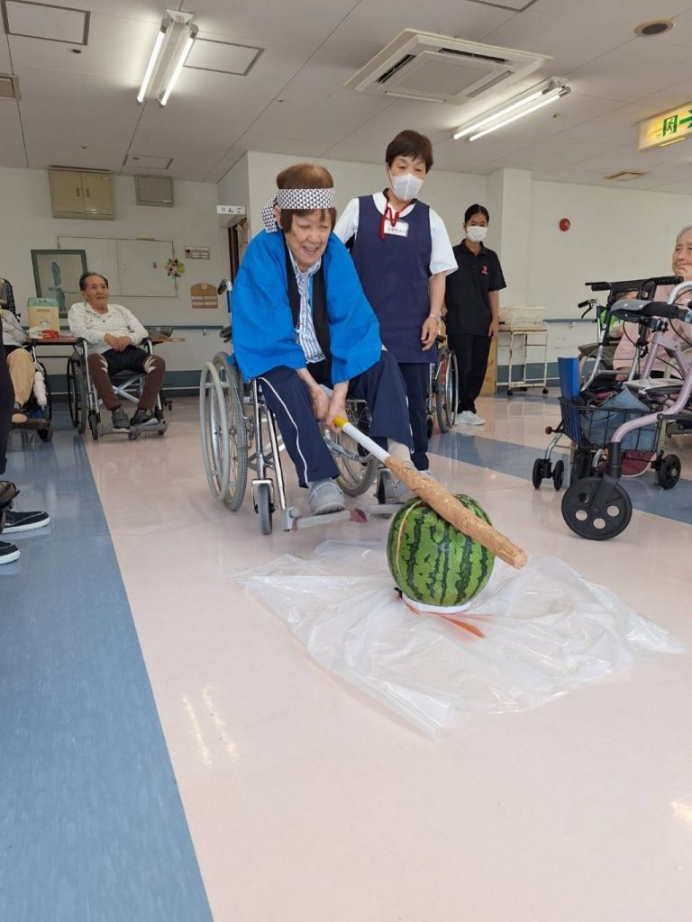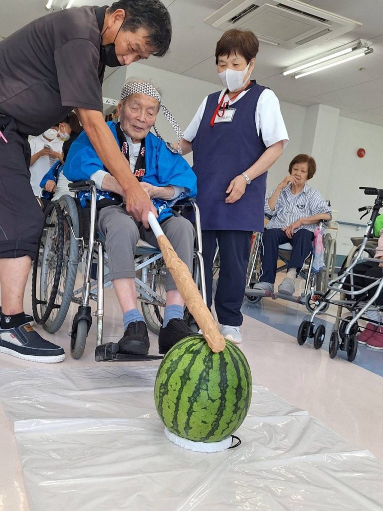 さくらの郷お誕生会【2025年7月】 さくらの郷 2025.07.19 7月19日にお誕生会を開催しました。 昼食はお誕生膳でお祝い。 昼からのお誕生会ではスイカ割りを楽しんで頂きました。 おやつには割ったスイカとかき氷を楽しんでいただきました。