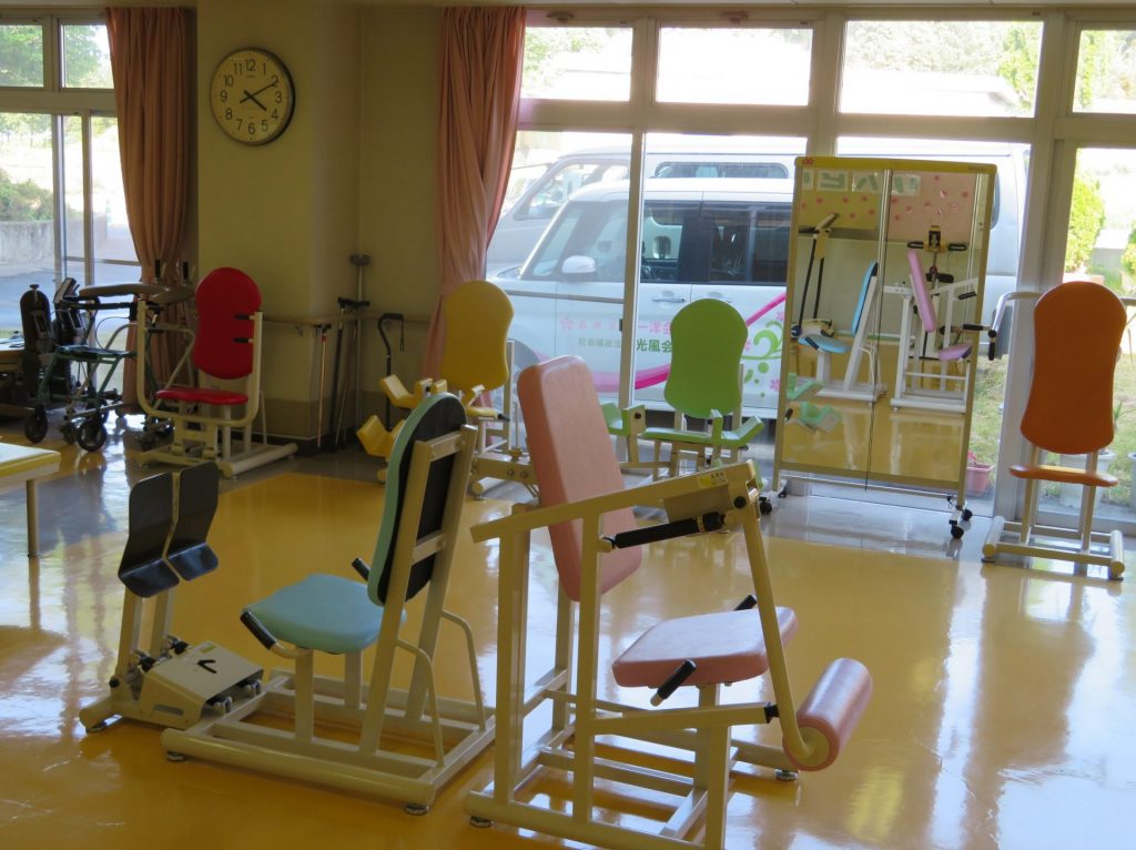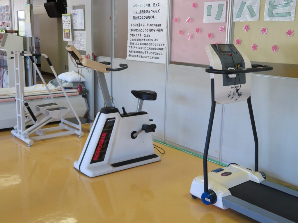 徳島さくらクリニックのリハビリ室には7種類のパワーリハビリの機械と、エアロバイク・ルームランナーを置いています。